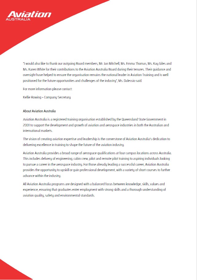 Aviation Australia’s Chair, Ms. Elsa Dalessio today welcomed four new directors to the Board. “The new directors bring a high level of industry expertise and experience to the Board that will continue to support Aviation Australia in providing world class training opportunities to the aviation and aerospace sector both domestically and internationally”, Ms. Dalessio said.